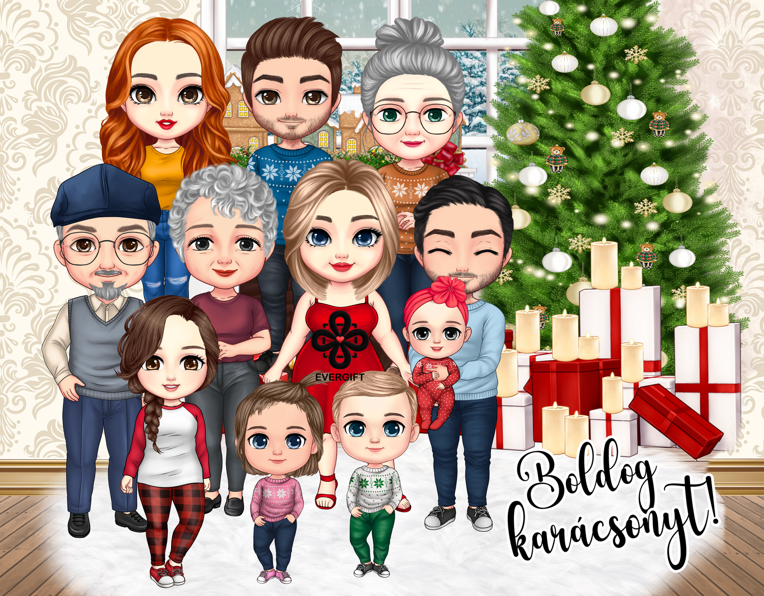 Karácsonyi cuki család, nagyszülőkkel és szülőkkel - személyre szabható falikép akár 5 gyerekkel