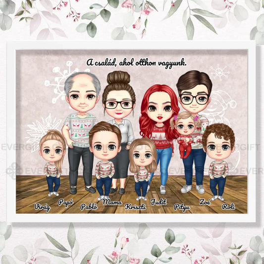 Karácsonyi cuki család, nagyszülőkkel és szülőkkel - személyre szabható falikép akár 5 gyerekkel